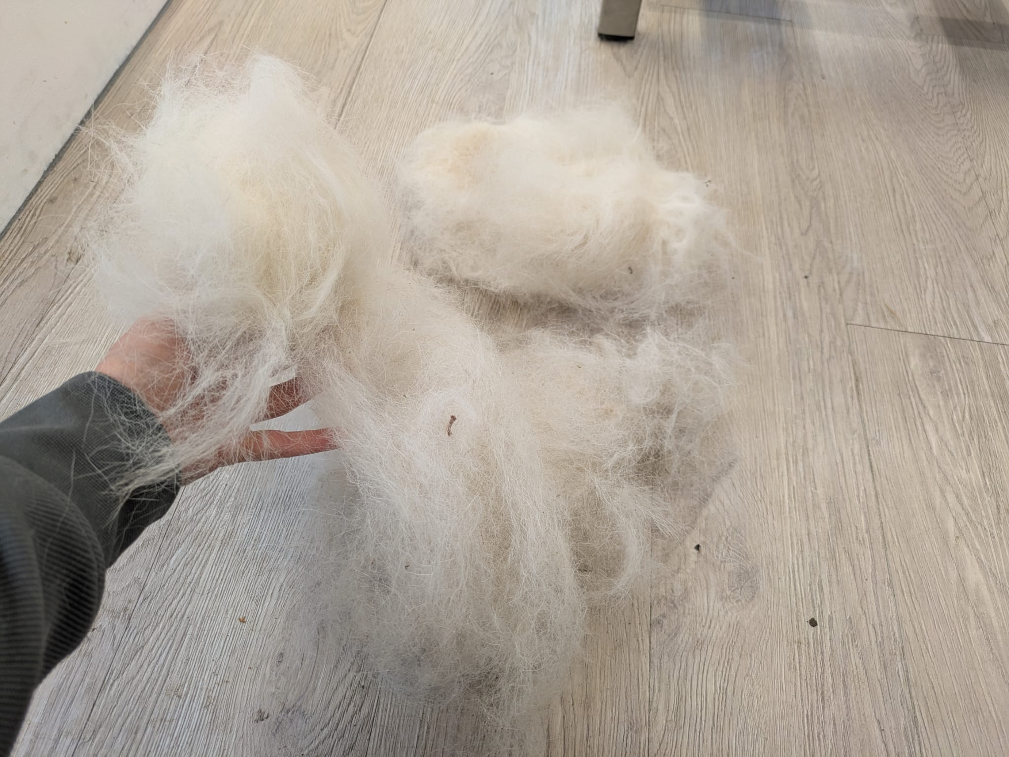 Mischling Leo erhielt in Ronny's Pflegehütte eine komplette Pflege: Waschen, Schneiden, Ohren- und Krallenpflege. Dabei kam eine beeindruckende Menge an losem Fell zum Vorschein – ein echtes Vorher-Nachher-Erlebnis!