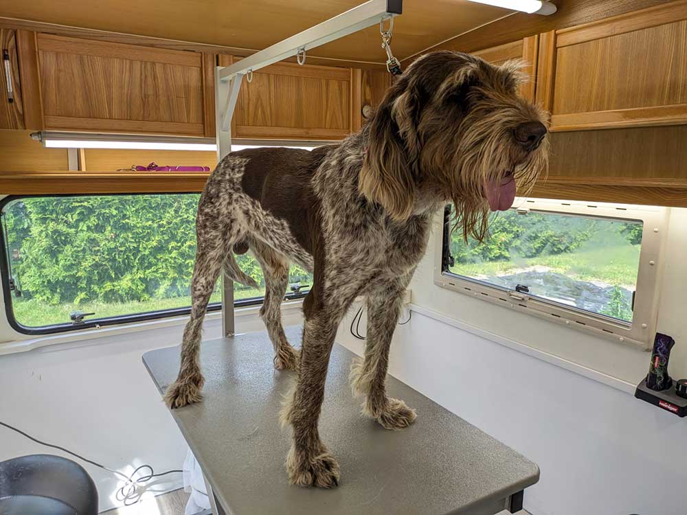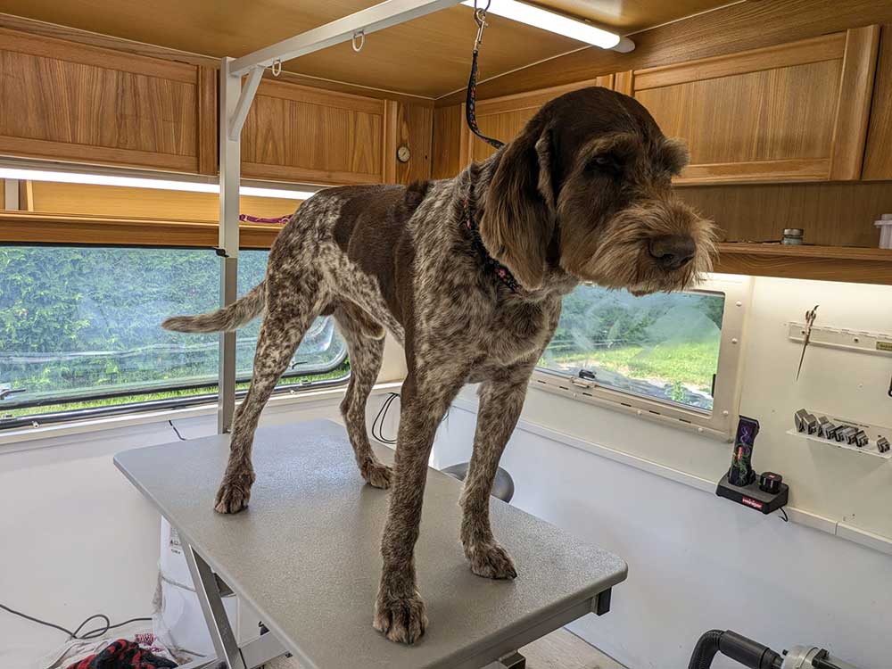Anschließend wurde eine dezente Fasson geschnitten, damit die typische Silhouette des Spinone erhalten bleibt. Der markante Bart wurde pflegeleichter gekürzt, ohne seinen Charakter zu verlieren – für mehr Sauberkeit im Alltag und trotzdem den unverkennbaren Look.