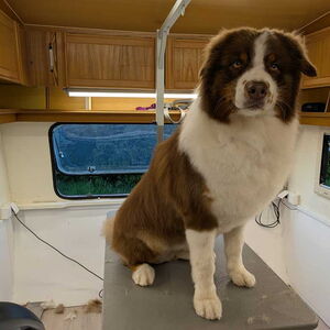 Merlin erhielt in Ronnys Pflegehütte eine komplette Pflege mit Baden, Föhnen und gründlichem Bürsten. Es wurde nur eine dezente Fasson geschnitten, um die Grundlänge seines schönen Fells zu erhalten – dank der guten Bürstpflege von Frauli kein Problem! Statt die Augen freizuschneiden, trägt Merlin seinen typischen Zopf, der natürlich wieder frisch gemacht wurde.
