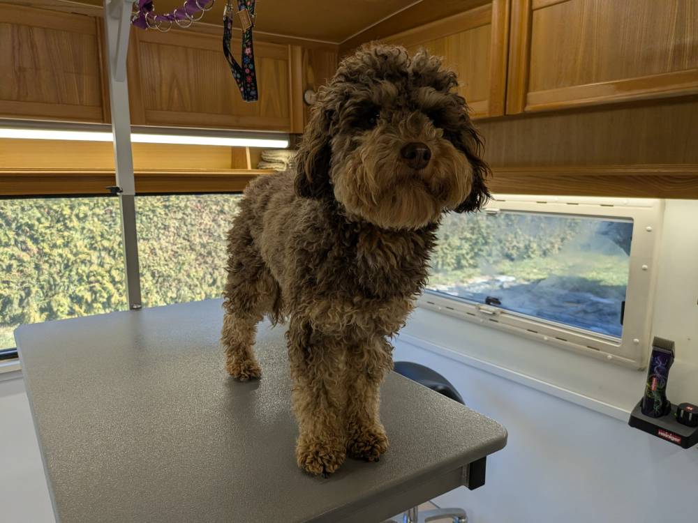 Zwergpudel Percy erhielt eine komplette Pflege mit Scheren, Waschen und Föhnen. Auf Kundenwunsch wurde ein sportlicher, natürlicher Schnitt gewählt, der seine lockige Fellstruktur betont, aber gleichzeitig pflegeleicht bleibt.